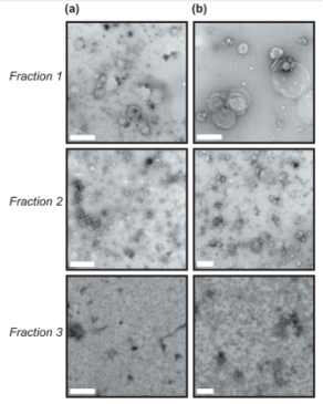 將新鮮冷凍(-80°C)人額葉皮質在冰上用剃刀刀片切片,產生1-2cm長、2-3mm寬的切片。冷凍切下的切片組織用75 U/mL 3型膠原酶在Hibernate-E中、37°C條件下消化20分鐘。消化后立即將組織放回冰中,加入蛋白酶和磷酸酶抑制劑。將組織在4℃下以300×g離心5分鐘(沉淀用作腦勻漿+膠原酶對照),將上清液轉移至新管中,在4℃下以2000×g離心10分鐘,然后在4℃以10,000×g離心30分鐘。將含有EV的上清液覆蓋在三重蔗糖墊(0.6M,1.3M,2.5M)上并以180,000×g超速離心3小時分離囊泡。棄去梯度的頂部,收集指定為1,2和3的級分并測量折射率。將每個級分進一步以100,000×g超速離心以沉淀每個級分中所含的囊泡。每個樣本均通過包括電子顯微鏡、RNA和蛋白質分析在內的技術組合進行驗證。注意:一些組織樣本不適合這種方法。取樣時間、儲存時間和凍融循環(huán)次數(shù)會對組織質量產生負面影響,并導致細胞碎片和非外泌體囊泡對組分產生污染。