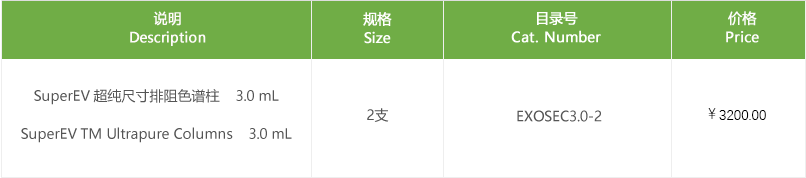 尺寸排阻色譜法(Size Exclusion Chromatography,SEC)被認(rèn)為是從不同樣本中分離和純化細(xì)胞外囊泡(EVs)的最佳方法之一,因為它能夠快速而有效地將EVs從復(fù)雜樣本中分離出來,并能保持EVs的原始形狀和生物學(xué)功能。我們開發(fā)了用于分離EVs的不同類型的SEC柱:SuperEV0.5,SuperEV1.0和SuperEV3.0,適合不同樣本和體積的EVs分離。此外,我們還提供SEC柱和濃縮柱的不同組合,既可以從更大體積的細(xì)胞培養(yǎng)上清或尿液中分離EVs,同時又可以將SEC柱分離的EVs進(jìn)一步濃縮和純化,提供完整的純凈EV的解決方法,適合于EVs的工業(yè)化制備。