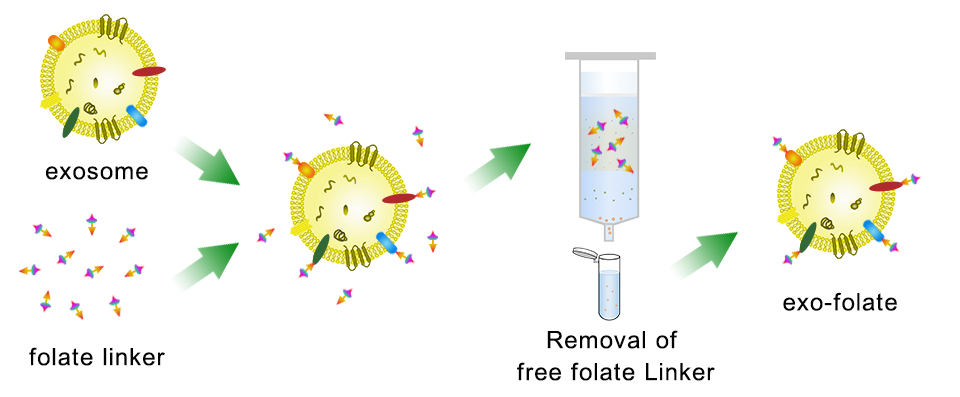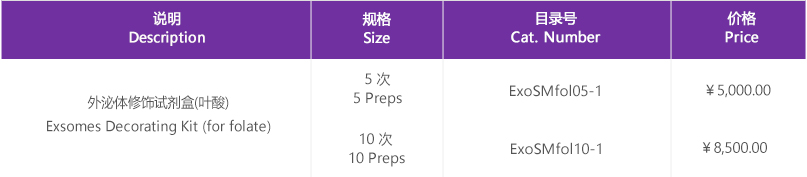 本試劑盒通過化學連接的方法,直接將葉酸以共價鍵方式偶聯(lián)在外泌體表面,再采用SEC 分子排阻柱將游離的葉酸去除,得到大量純凈的葉酸靶向外泌體。本試劑盒葉酸修飾效率高,反應條件溫和,生理條件下即可發(fā)生反應,反應特異性好,無有害副產物,不損傷外泌體膜結構,也不影響外泌體的生物活性和功能,為外泌體靶向提供了一種高效、簡便的修飾手段,可實現(xiàn)葉酸靶向外泌體的大規(guī)模制備。